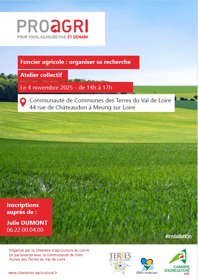 La Chambre d’Agriculture du Loiret en partenariat avec la Communauté de Communes des Terres du Val de Loire vous invite à un atelier dédié à la recherche de foncier, le mardi 4 novembre de 14h à 17h à Meung-sur-Loire (44 rue de Châteaudun).